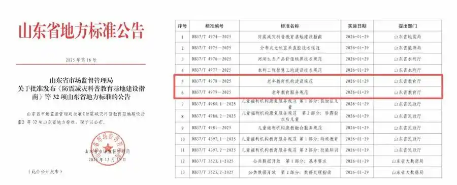 2025年12月29日,山东省市场监督管理局发布公告,正式批准发布《老年教育机构建设规范》《老年教育服务规范》两项山东省地方标准。这是山东省首次针对老年教育领域制定的地方标准,山东开放大学作为主要起草单位之一,全程主导并深度参与了标准的调研、起草与论证工作,为标准的科学性与实用性提供了关键支撑。